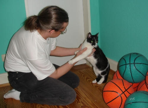 Hypnocat Nachdem ich ja schon mit den verschiedensten Lebewesen gearbeitet habe, ergab sich hier eine gute Gelegenheit, etwas Neues auszuprobieren. Abrupta XXVII. wollte ständig in Richtung Hypnosesessel, Andreas wollte dieses verhindern - aber elegant, nicht mit rumschreien oder Wasserbespritzungen. Meiner Theorie folgend, habe ich die Katze (Abrupta XXVII.) leicht hochgehoben und mit freundlichem Schwung in die vom-Sessel-weg-Richtung bewegt. Das erwartete Ergebnis war eine sofortige Wende und an mir vorbei zum Sessel, klar. Trotzdem habe ich diesen Ablauf noch zweimal wiederholt, Musterverfestigung. Und jetzt der geplante Trick: Ich hebe sie an, beschleunige sie Richtung Hypnosesessel, sie kehrt sofort um und läuft an mir vorbei und verlässt den Raum. Ein Gewohnheitstier also. So leicht kann es gehen, jetzt noch eine Tieftrance für den spontanen Gast, zu ihrer allgemeinen Beruhigung und um die Besitzersuchzeit zu überbrücken.